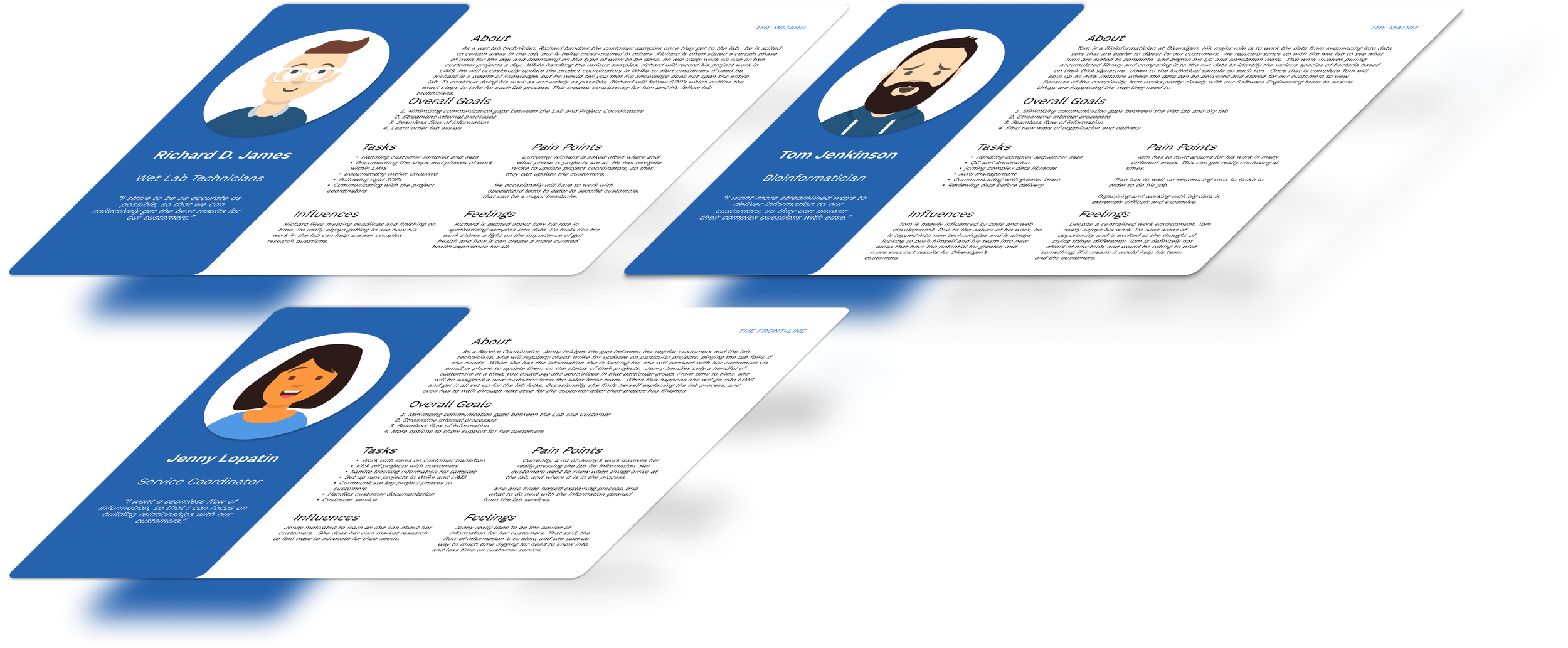 LIMS is a completely internal application with folks from many different roles accessing it so capturing separate persons was necessary to understand their unique perspective and needs. At Diversigen, the internal users included lab technicians, scientists, bioinformaticians, Quality assurance, lab managers and many more.